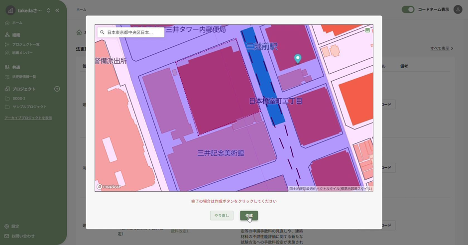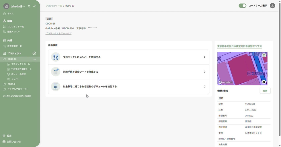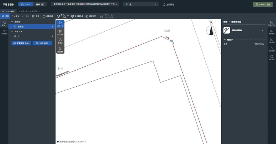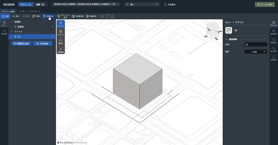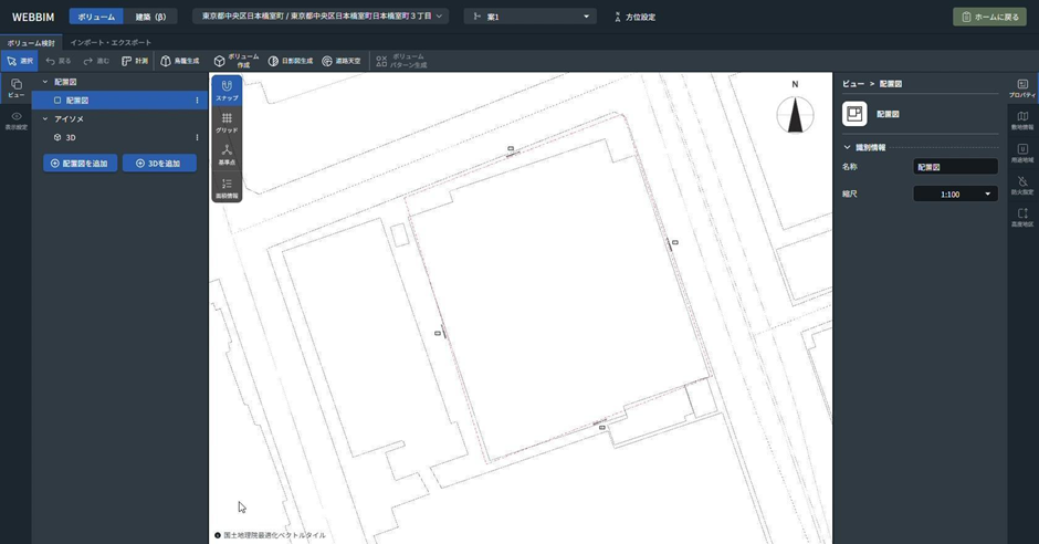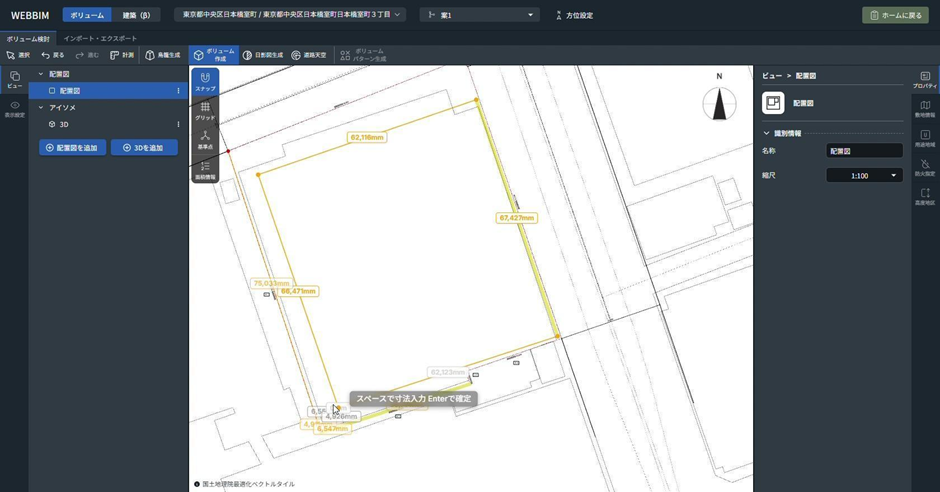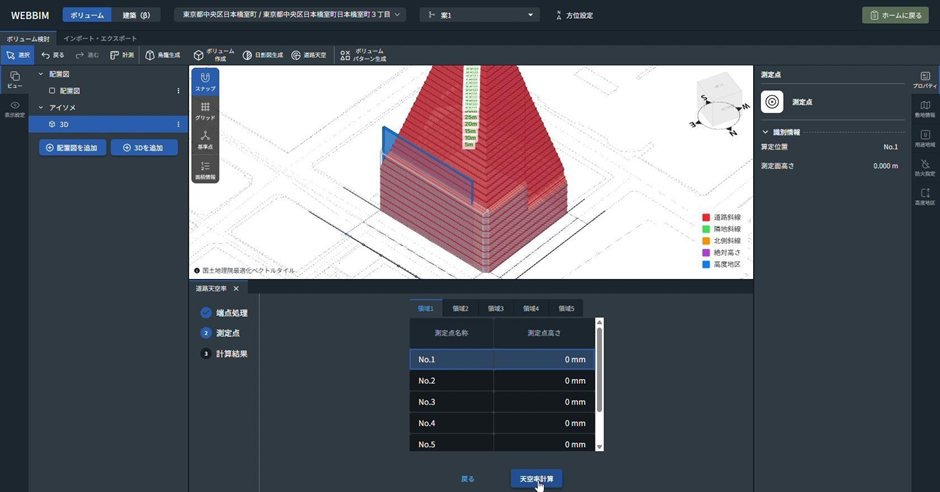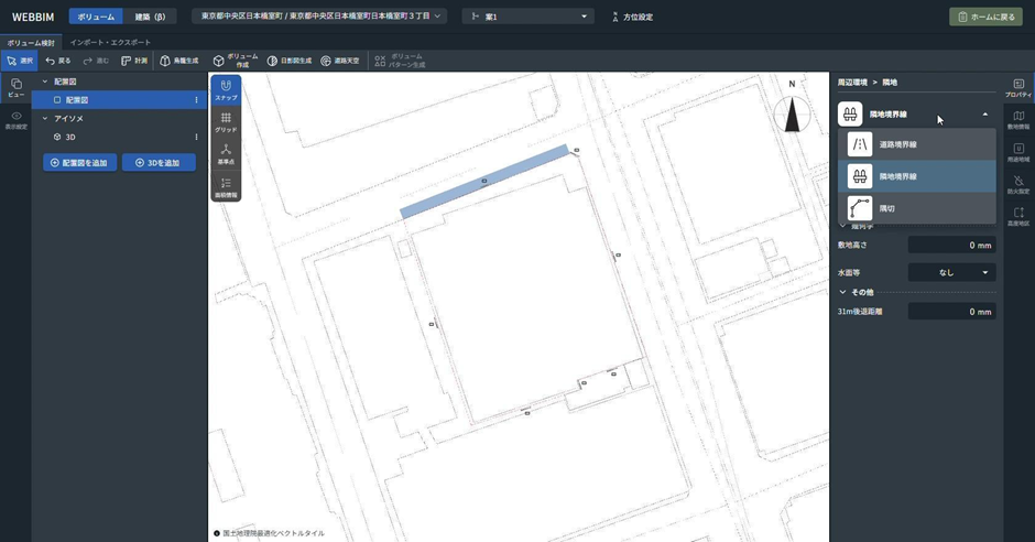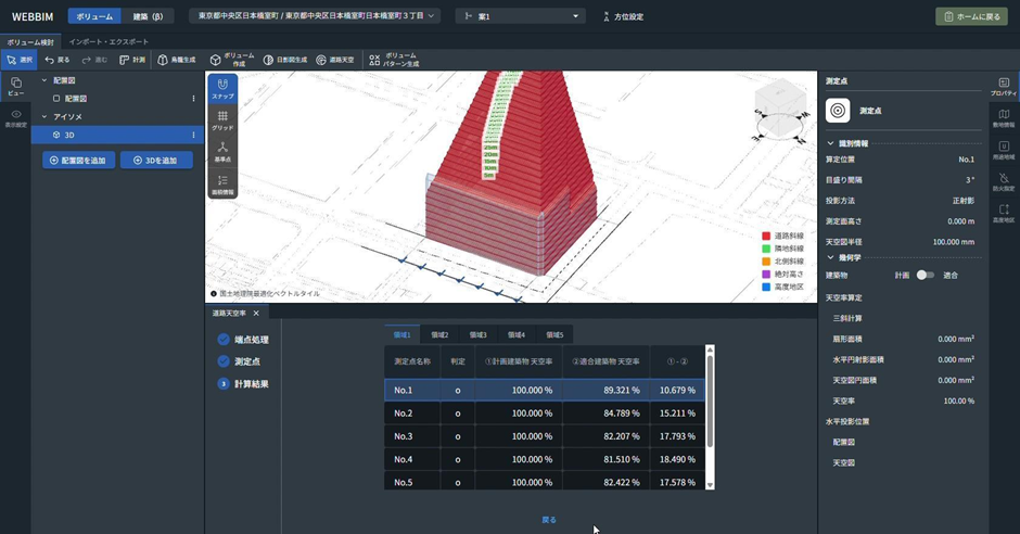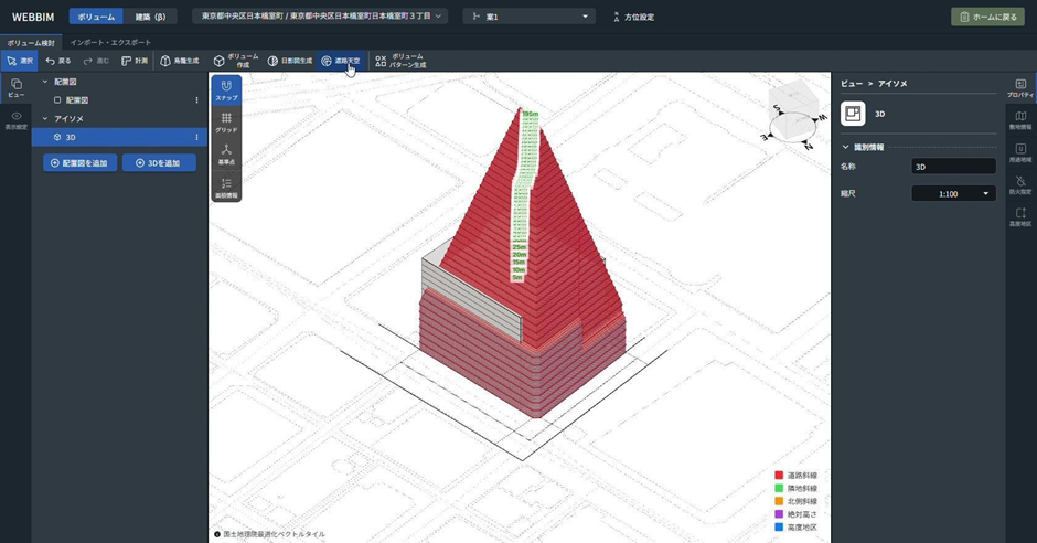 住所を入力することで都市計画情報を自動取得し、そのままボリューム生成へと進むことができ、さらに日影規制や天空率の検討まで1つのWebブラウザ上で行うことができます。