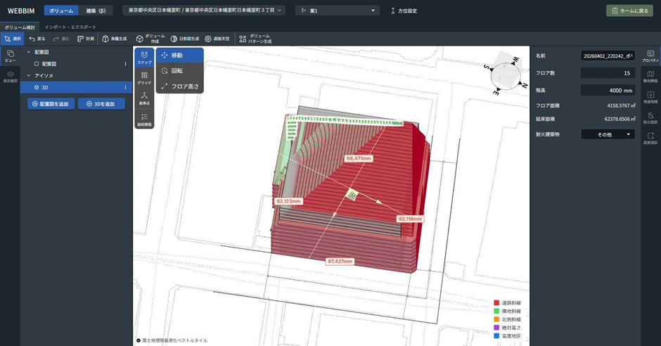 以下は、住所入力から敷地を取得し、鳥かご生成、ボリューム生成、道路天空と操作を進めた時の操作画面の流れです。